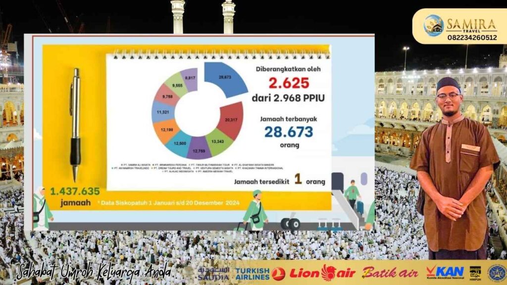 Sejak 2021 sampai Mei 2025 alhamdulillah samira travel menjadi travel dengan jamaah terbanyak di Indonesia. Pencapaian ini menandakan samira travel adalah travel umroh yang amanah dan bisa dipercaya untuk mewujudkan impian anda menjalankan ibadah umroh yang mabrur. Selama 2024 Samira Travel tercatat memberangkatkan 28.673 Jamaah.