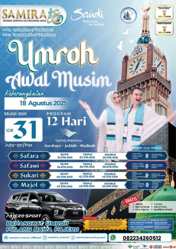 Samira Travel Pasuruan terdaftar resmi di Kementerian Agama, telah memberangkatkan ribuan jamaah, dan mendapatkan banyak testimoni positif dari jamaah. Kepercayaan yang kami dapat kami bangun dari transparansi biaya, kejelasan jadwal, dan komitmen dalam menjaga kenyamanan dan keamanan jamaah.